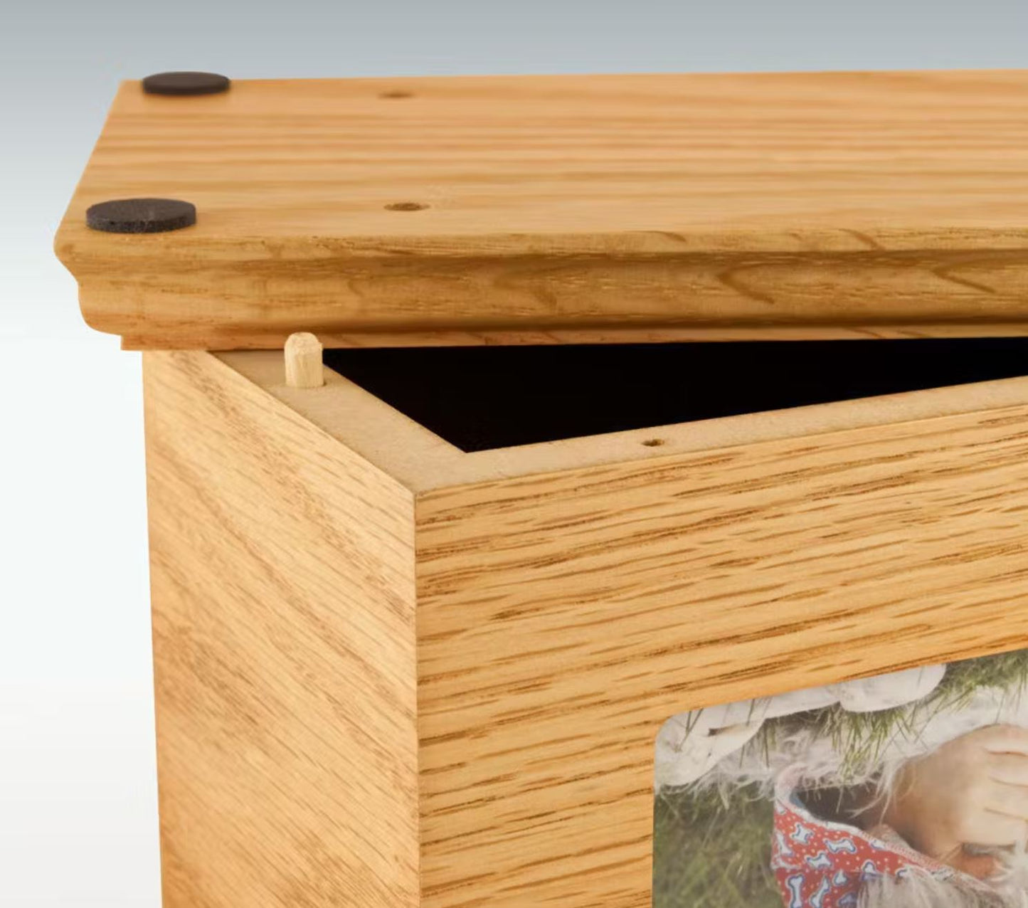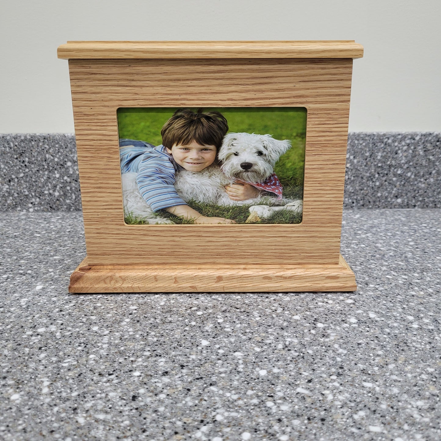 Oak picture frame urn with horizontal picture. Your favorite photo can be placed behind the acrylic window by removing the bottom of the urn.